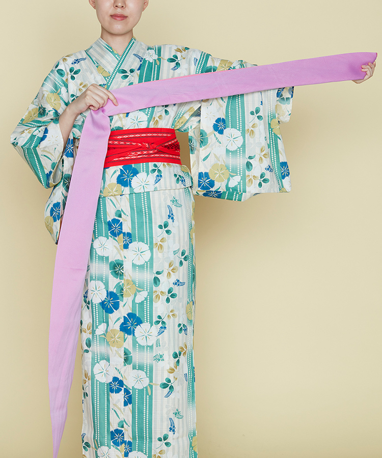 中央に寄ったしわを左右のバランスを見ながら外側に伸ばしたら、10で結んだ腰紐を覆うように伊達締めを締めます。