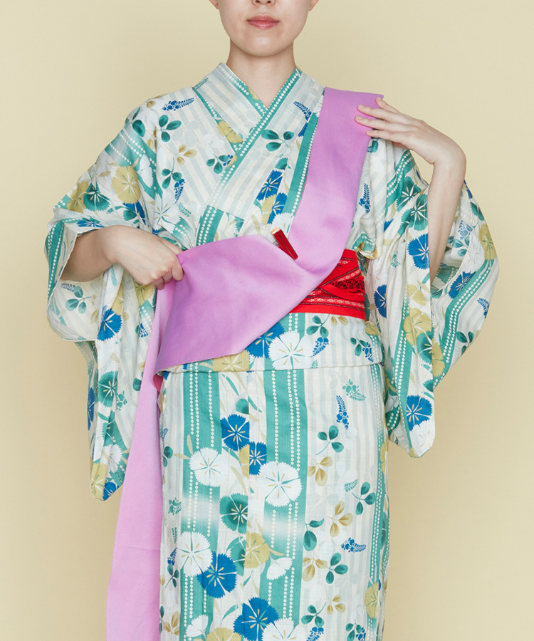 折り目の山が外側にくるようにし、左肩に手先をかけたら、伊達締めと重なる部分でクリップをとめます。