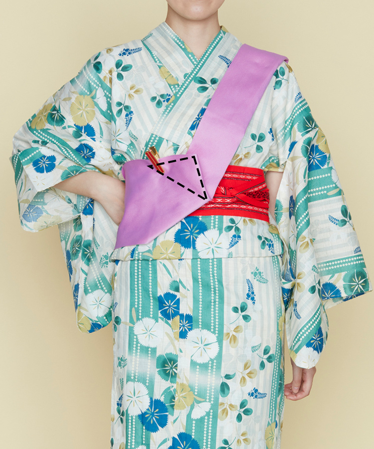 引き上げた手先を帯の間に通し、帯の下から引き出します。引き出した手先は折りたたみ、見えないよう帯の中にしまいます。