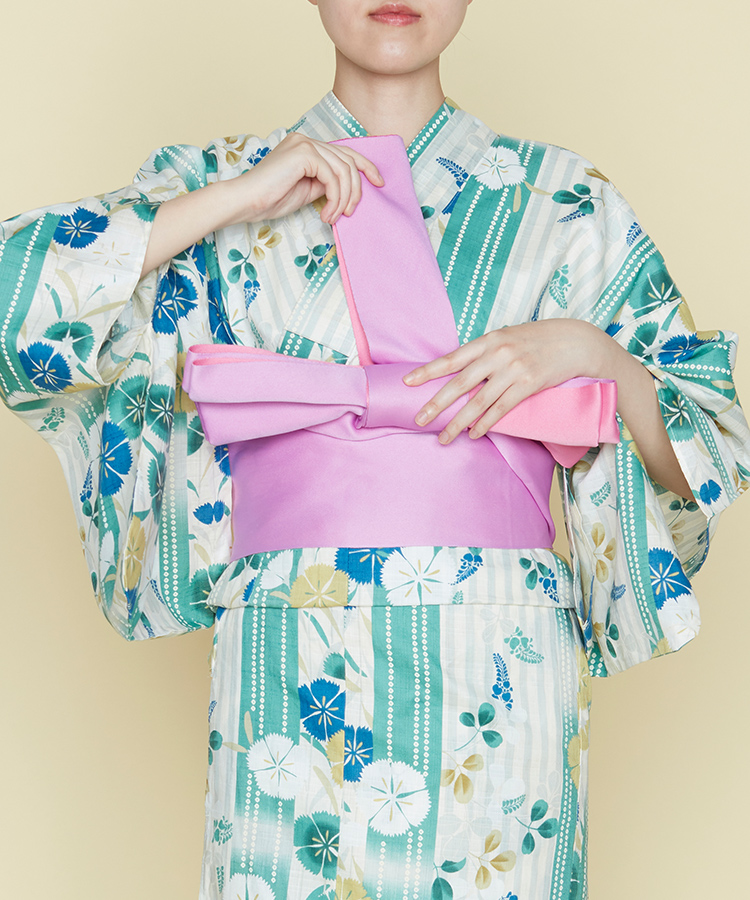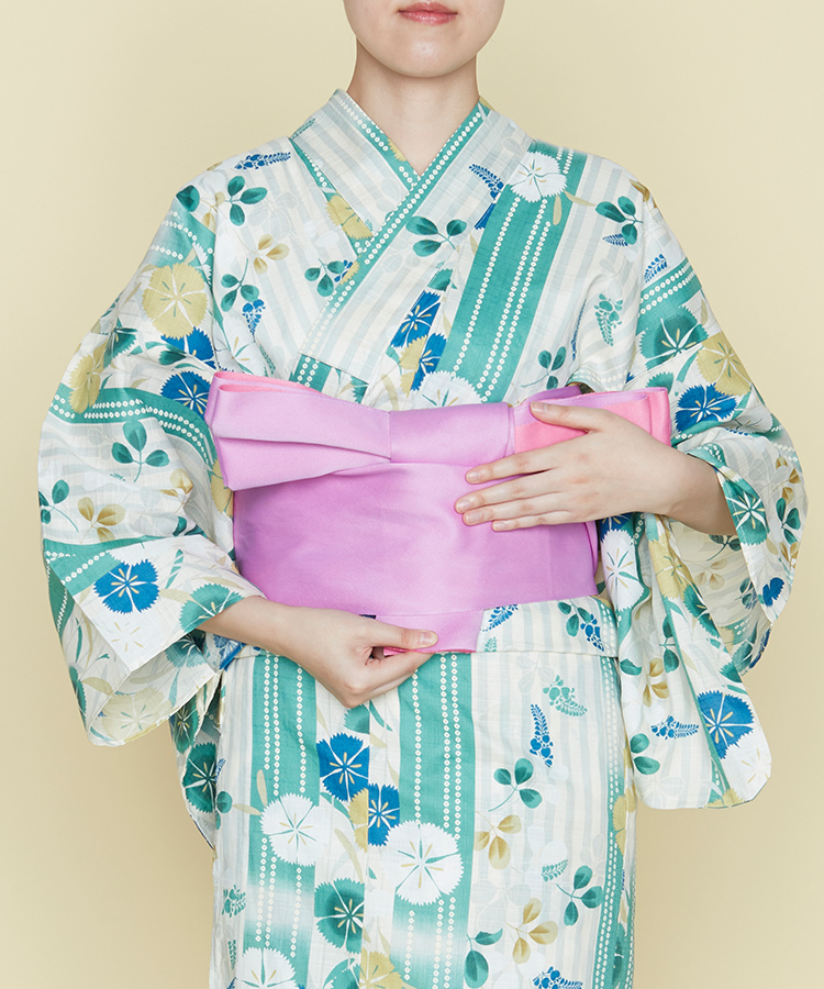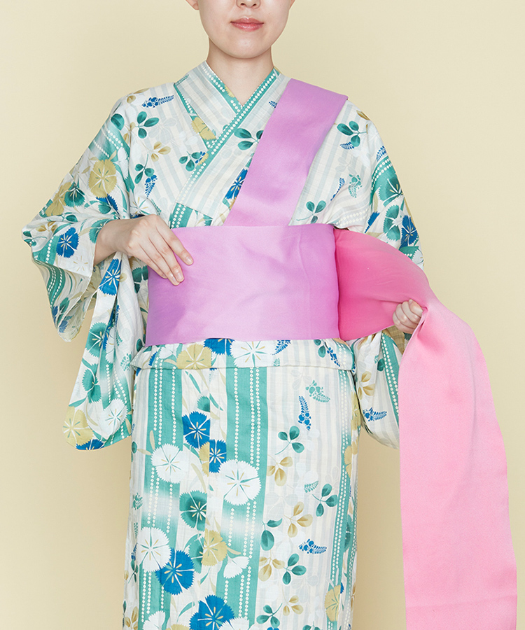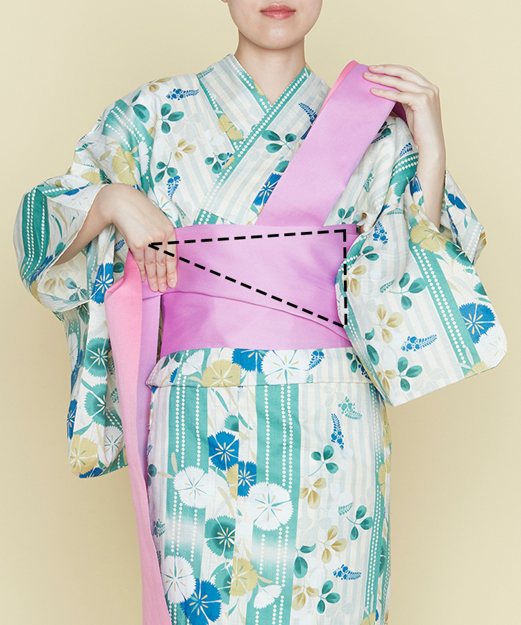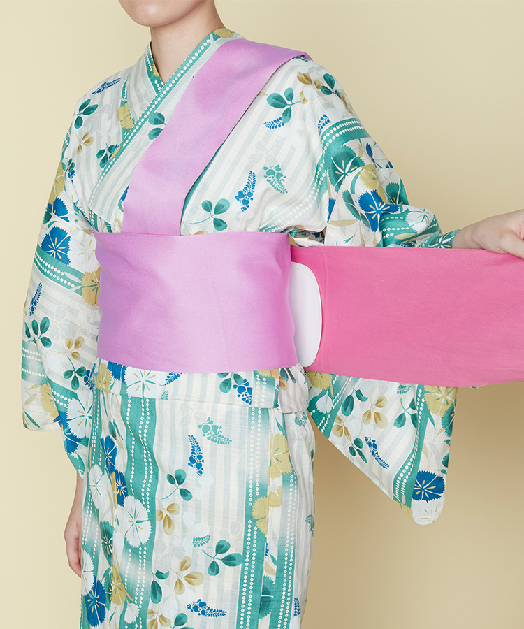 帯の位置が動かないよう手で押さえながらもう一巻きし、ぎゅっと締めます。