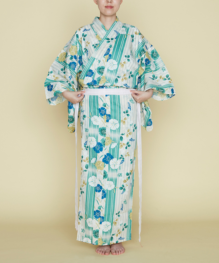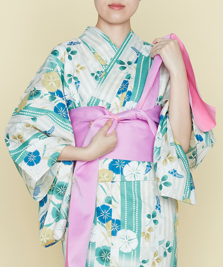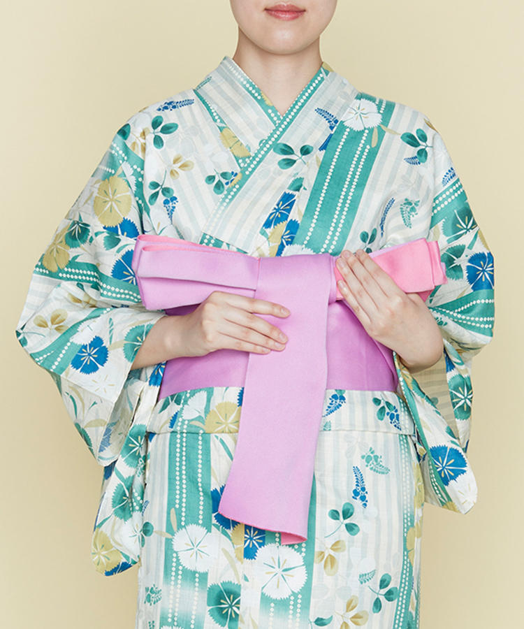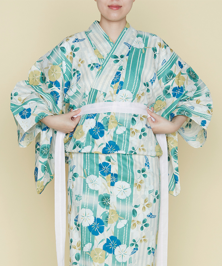 腰紐を腰骨の少し上にあてたら後ろで交差させ、両手でぎゅっと締めます。そのまま前に回したら、左右どちらかの腰骨のあたりで結びます。結び目は紐に絡ませ、邪魔にならないようにしましょう。