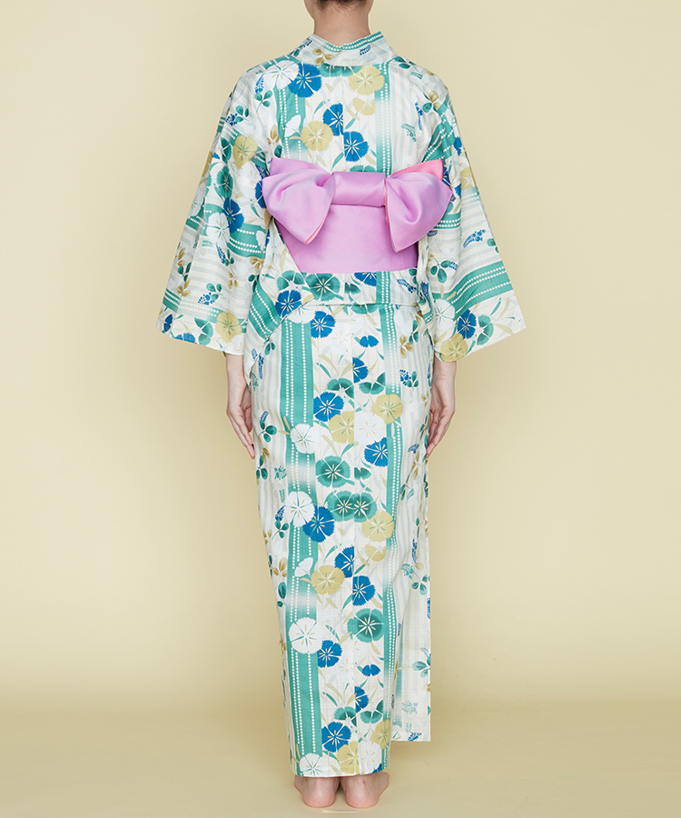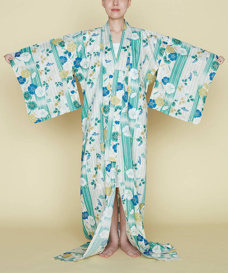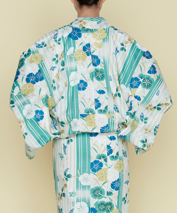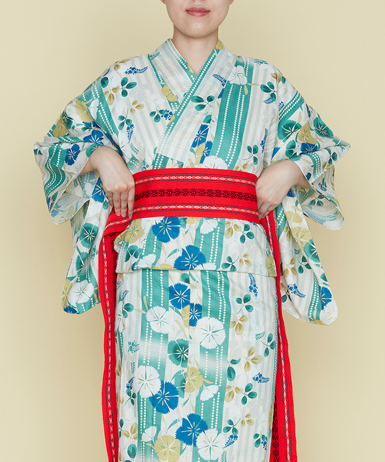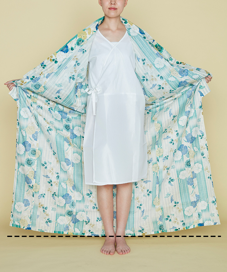 浴衣を羽織ったら、両腕を伸ばして左右の袖口を引っ張り、背中の中心の縫い目(=背縫い)を自分の背骨と合わせます。