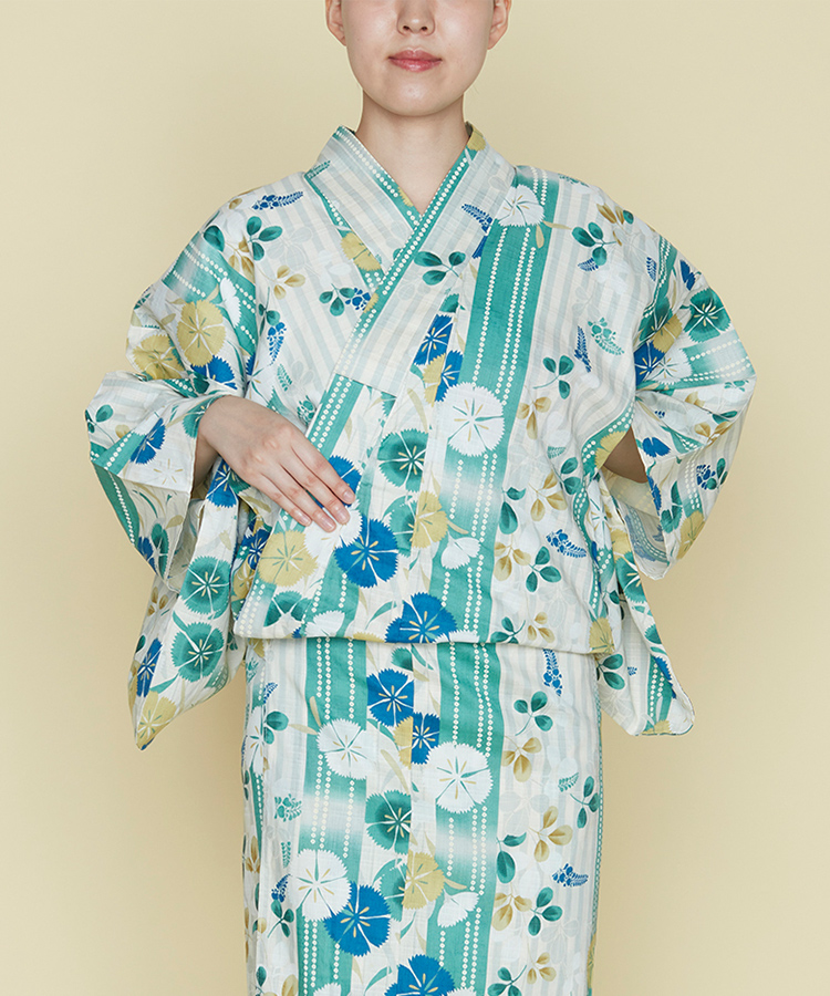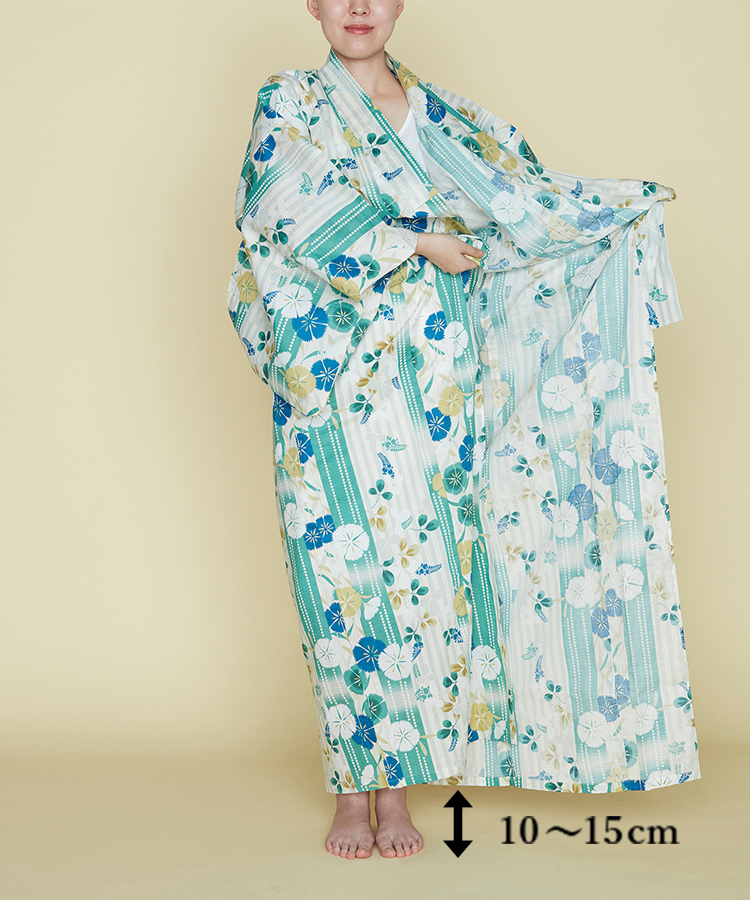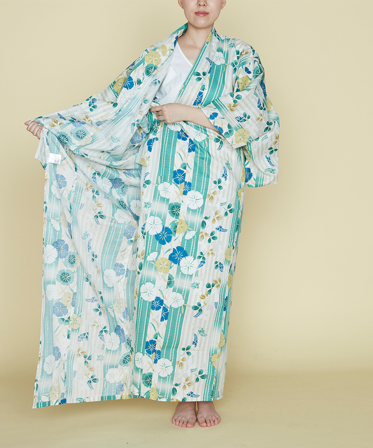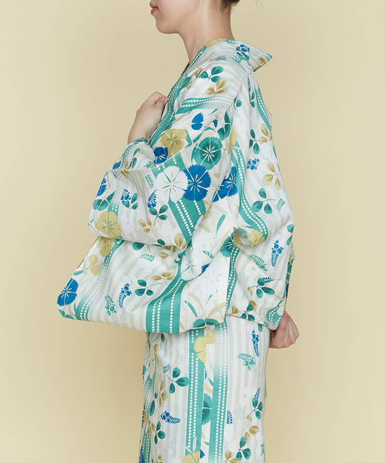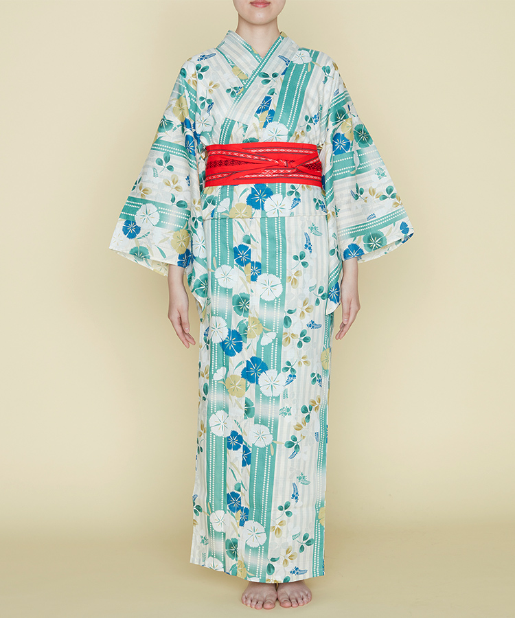浴衣を羽織ったら、両腕を伸ばして左右の袖口を引っ張り、背中の中心の縫い目(=背縫い)を自分の背骨と合わせます。