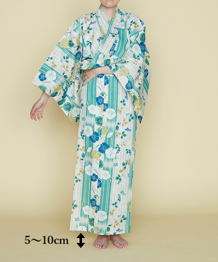 体に添わせた下前がずれないよう、左ひじを左脇につけ下前を押さえながら、上前を右脇に持っていきます。上前を重ねたら、褄先を裾線から5~10cmほど上げます。下前より上げすぎないのがポイントです。